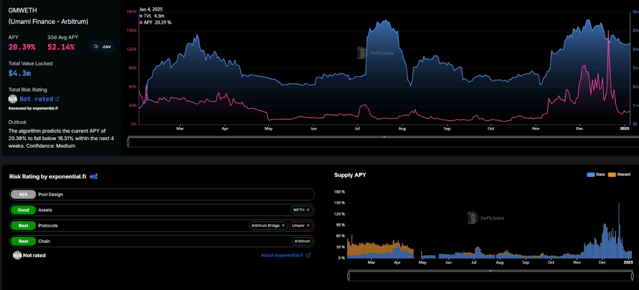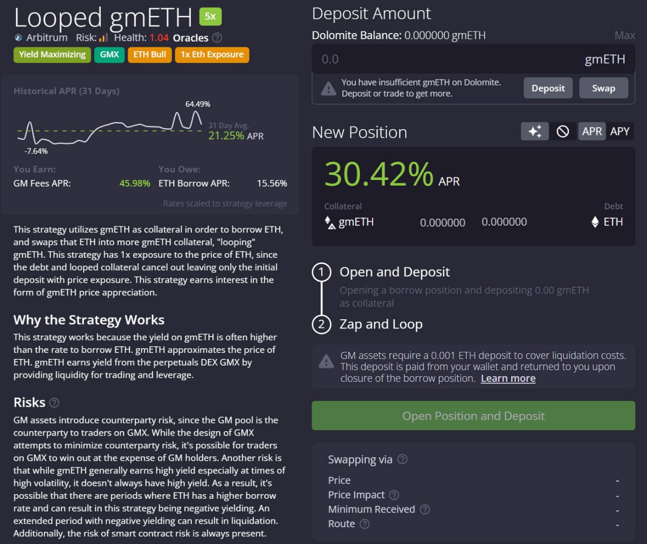 gmETH策略存在争议,因为它曾经历过本金损失。 该策略利用GMX交易者的超额收益,收益与ETH价格波动相关。 在Dolomite平台上,目前APR约为30%,历史平均APR约为20%。