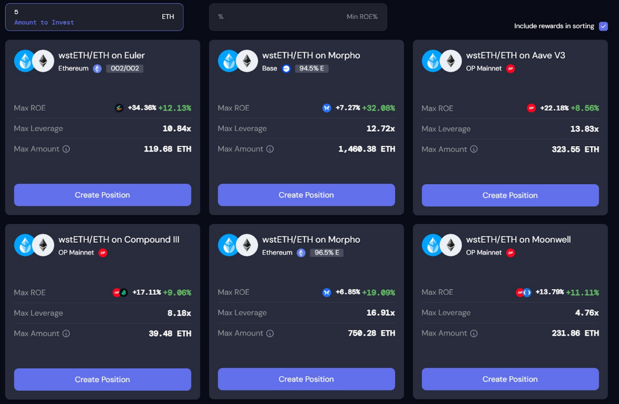 wstETH策略是目前最受欢迎、**竞争力和可扩展性的策略之一,即使在熊市,APR通常也在8%到30%之间。该策略利用ETH质押收益抵消借贷成本。 操作平台包括Morpho Labs、Aave、Compound Growth和Euler Labs,目前APR约在26%到46%之间。 此外,利用Contango等工具可以获得额外收益,例如TANGO积分和OP emissions。