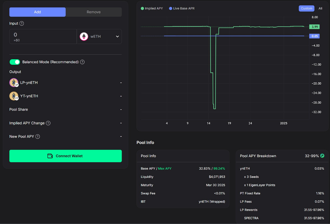 Spectra平台上的ynETH池提供了一个市场机会,无boost时APR为33%,有boost时APR可达100%。 持有或锁定SPECTRA可能会有额外收益。