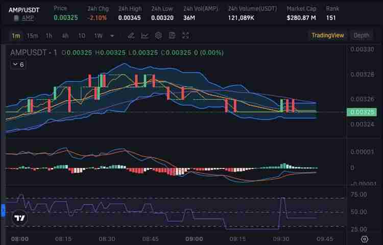 AMP 目前的股价为 0.00325 美元,过去 24 小时内下跌了 2.10%。1 分钟 K 线图显示 AMP 价格在窄幅区间内横盘整理,预示着近期动能不足。