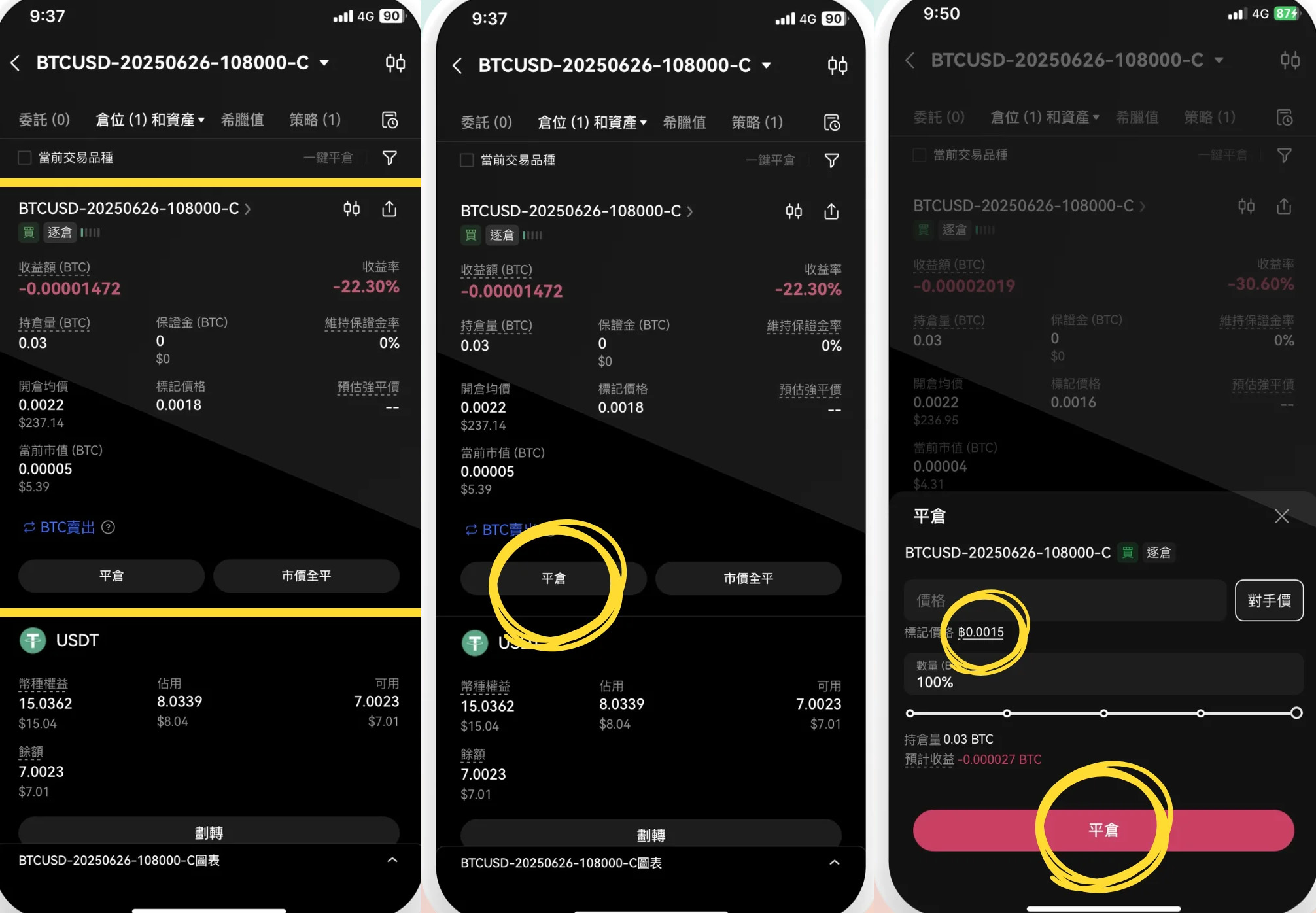 从图片可以看到我买入的是0.03 颗比特币(市值约3, 200 U)的期权合约,标记价格0.0022 成本大约是7.67 USDT,说明我们只需要用小量的资金,就可以在期权市场里参与比特币的波动,当标记价格掉到0.0018 时平仓,回到手上的钱就会剩下5U 左右,而若是在标记价格升到0.003 时平仓,就会有大约9U 入帐,扣到原本的成本7.67 后就是净利。