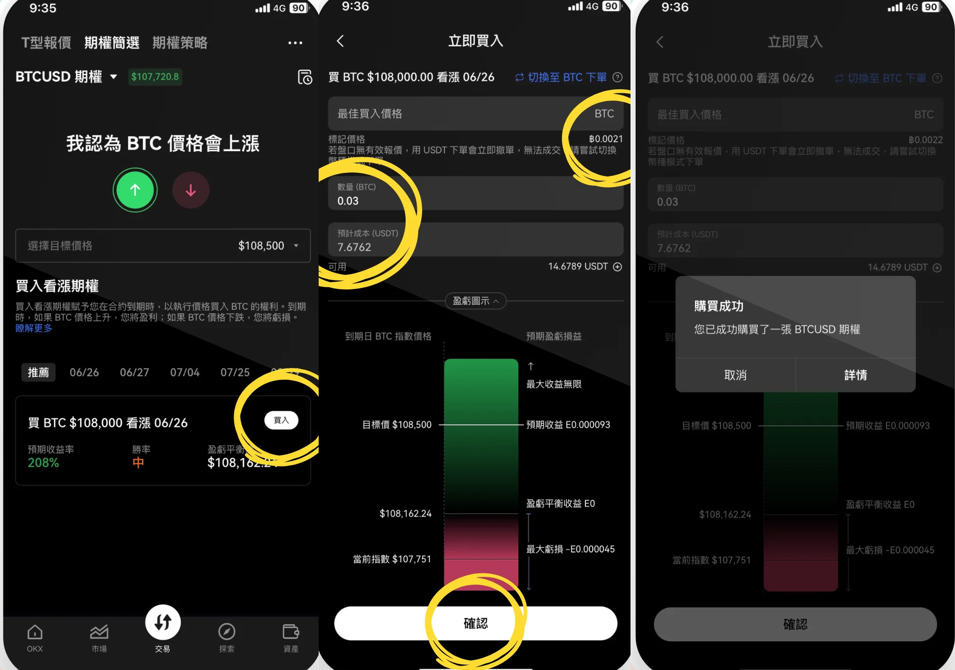 在数量的右上方可以看到一排小字「标记价格」,这个标记价格并不是固定的,而是会随市场变化而变动,「标的价格×标记价格×数量」算出来就大约是买这个期权合约要付的钱(实际会再加入手续费,会再高一点点),不会算也没关系,因为输入数量后,系统就会自动帮你计算「预计成本」。