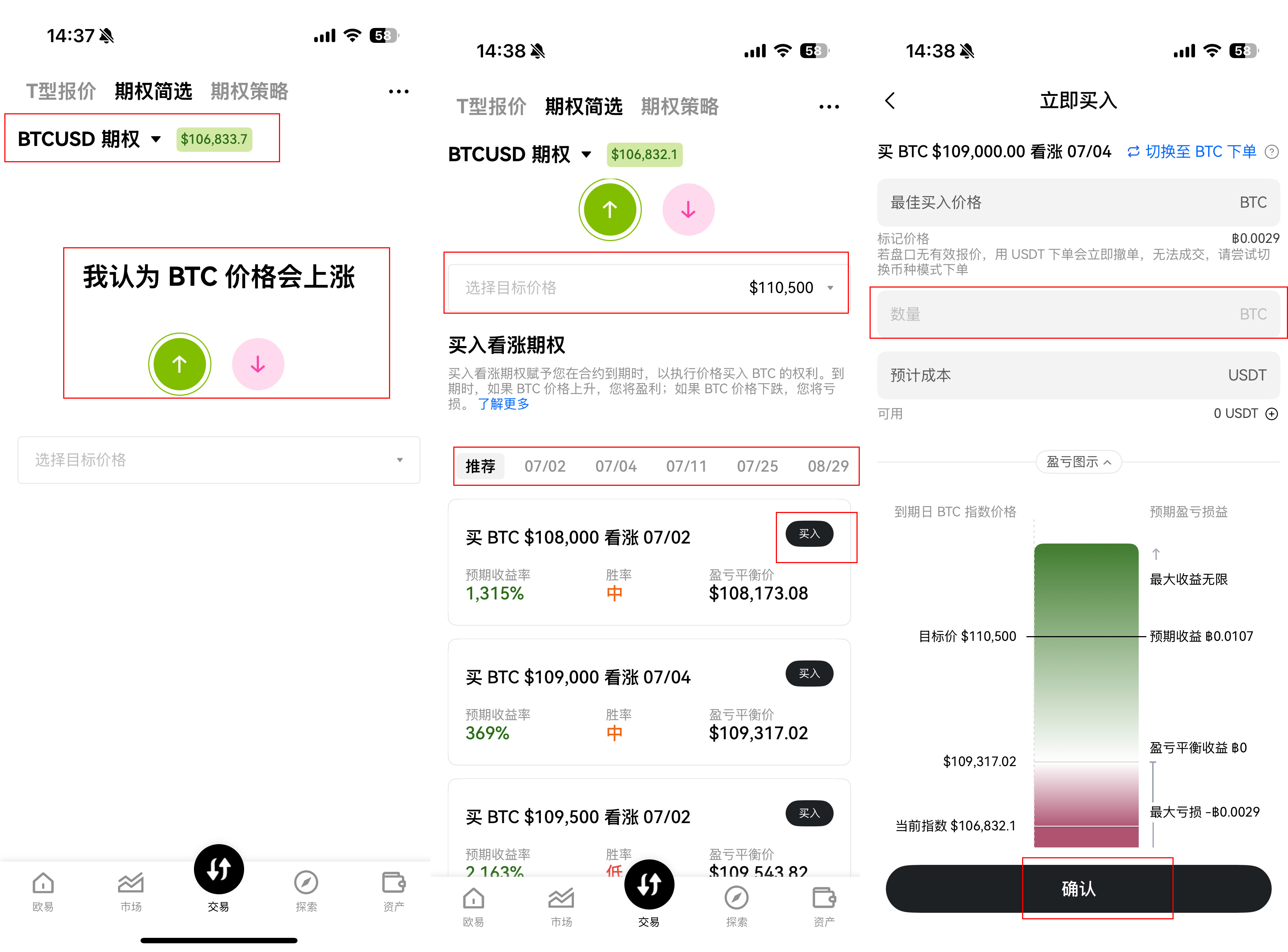 - 系统显示购买成功,你已购买一张BTCUSD 期权。