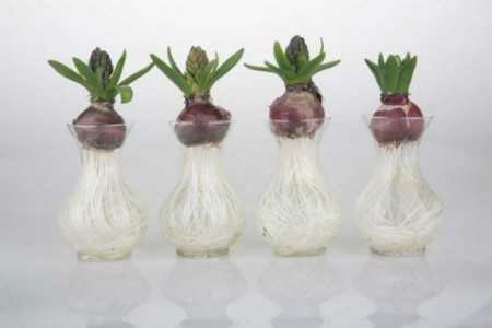 3、放入瓶口:种球泡好之后将它放在专用的盛有水的容器口上就行。注意水量不能太多,根盘不能沾水。处理好之后用报纸遮光,放在黑暗处 。大概遮光半月左右,期间注意每五天就要换水一次,等它的根系长出后要隔七天换一次,并往水里滴加适量营养液,促进生根。