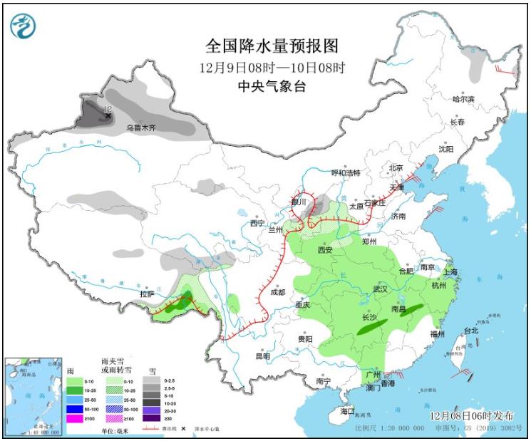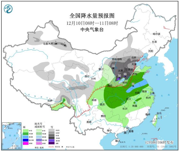 12月10日08时至11日08时,新疆沿天山地区和伊犁河谷、内蒙古河套地区、西藏北部和东部、川西高原北部、西北地区中部和东北部、华北、黄淮北部等地部分地区有小到中雪或雨夹雪,其中,新疆沿天山地区、陕西北部、山西中南部、河北中南部、北京西南部、天津南部、山东西北部、河南北部等地部分地区有大到暴雪或雨夹雪,局地大暴雪(20~22毫米)。西北地区东南部、黄淮中南部、江淮、江汉、江南大部、西南地区东部、华南北部、台湾岛等地部分地区有小到中雨,其中,河南南部和西部、安徽北部、江苏北部、湖北北部等地部分地区有大雨(25~35毫米)。黑龙江东北部部分地区有4~6级风。