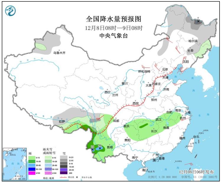 12月8日08时至9日08时,内蒙古东北部、黑龙江、吉林中东部、辽宁北部、新疆北疆、西藏东部、川西高原西部等地部分地区有小到中雪或雨夹雪,其中,黑龙江北部局地有大雪(5~7毫米)。西藏南部、四川中西部、云南大部、重庆东南部、贵州东部和北部、湖南中北部、江西北部、湖北南部、安徽南部、浙江西部等地部分地区有小到中雨,其中云南西部局地有大雨(25~40毫米)。内蒙古中东部、河北北部、辽东半岛、山东半岛、浙江东部等地部分地区有4~6级风。