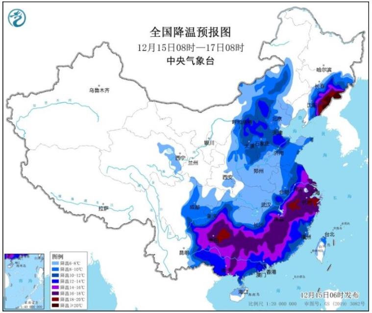 **气象台12月15日06时继续发布寒潮橙色预警:受寒潮影响,预计,12月15日08时至12月17日08时,内蒙古中部、东北地区东部、华北大部、黄淮东部、江淮大部、江南、西南地区东部、华南等地气温将下降8~12℃,其中,辽宁东部、吉林东部、江淮东部、江南大部、西南地区东南部、华南大部等地降温14~16℃,吉林东南部、辽宁东部、贵州东部、江南东部部分地区降温超过18℃。上述大部地区伴有4~6级偏北风,阵风可达7~9级,局地超过10级,东部和南部海区有6~8级、阵风9~10级大风。17日早晨**气温0℃线可南压至贵州南部和江南北部一带,-10℃线位于黄淮北部至秦岭一带。华北、黄淮北部等地的部分地区**气温将接近或达到历史同期极值。