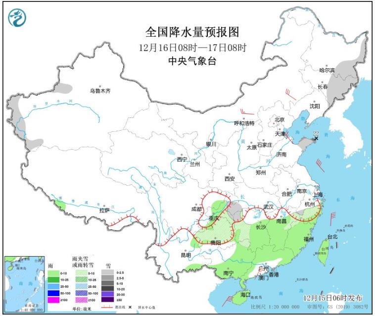 12月15日08时至16日08时,西北地区东南部、内蒙古东部、东北地区中东部和南部、黄淮、江淮大部、江汉等地部分地区有小雪或雨夹雪,其中,吉林东部、辽宁东北部、山东北部等地部分地区有中到大雪,局地暴雪(10~12毫米)。江南、西南地区东部、华南、台湾岛等地部分地区有小到中雨,其中,江西北部、浙江中南部、福建北部等地部分地区有大雨(25~45毫米)。内蒙古西南部、辽东半岛、江苏北部等地部分地区有4~6级风,其中,青海南部部分地区有6~7级风。