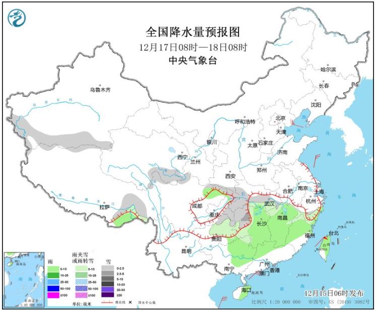 12月17日08时至18日08时,新疆南疆盆地、西藏北部和东南部、青海南部、江汉、湖南北部和西部、江西北部、浙江南部、川西高原北部、重庆东北部、西南地区东南部等地部分地区有小到中雪或雨夹雪。湖南东部和南部、江西大部、福建大部、四川盆地北部、广西东部、广东西北部、海南岛东北部、台湾岛大部等地部分地区有小雨。