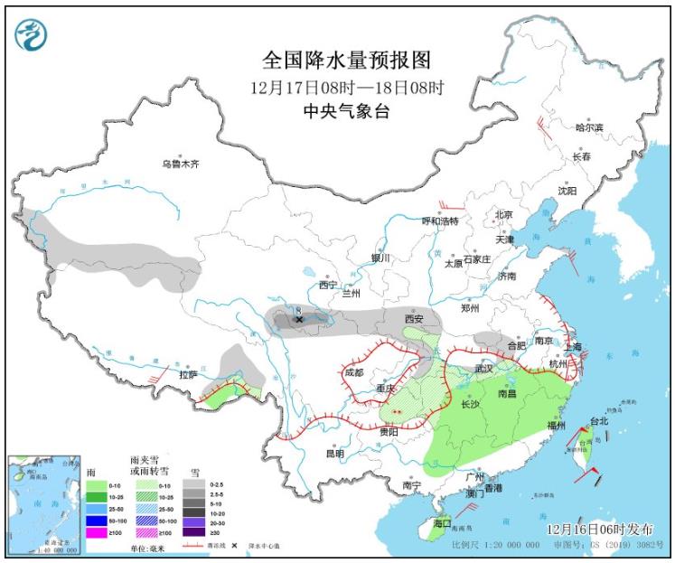 12月17日08时至18日08时,新疆南疆高海拔山区、青海东南部、甘肃南部、陕西南部、川西高原北部、江汉南部、江淮西部、湖南西部和北部等地部分地区有小到中雪或雨夹雪,其中,青海东南部局地有大雪,贵州东北部等地的部分地区有冻雨。江南大部、华南北部、台湾岛大部等地部分地区有小雨。西藏南部、浙江中部等地部分地区有4~6级风。