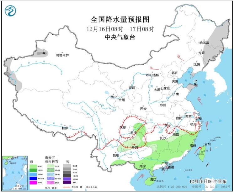 12月16日08时至17日08时,新疆伊犁河谷和南疆西部山区、东北地区东部、山东半岛、江西北部、贵州中部等地部分地区有小到中雪或雨夹雪,其中,新疆伊犁河谷、山东半岛北部等地局地有大到暴雪(10~12毫米),贵州中部的部分地区有冻雨。重庆东南部、江南南部华南大部、台湾岛等地部分地区有小雨。内蒙古中部、江苏南部、浙江中东部等地部分地区有4~6级风。