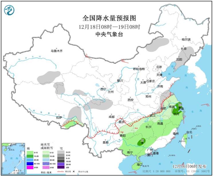 12月18日08时至19日08时,辽宁中东部、吉林东部、江淮、江南北部、川西高原北部等地部分地区有小雪或雨夹雪,贵州中东部的部分地区有冻雨。江南中东部、华南大部、台湾岛等地部分地区有小雨,其中,安徽南部、江苏中南部、上海、浙江北部等地部分地区有中雨(10~15毫米)。