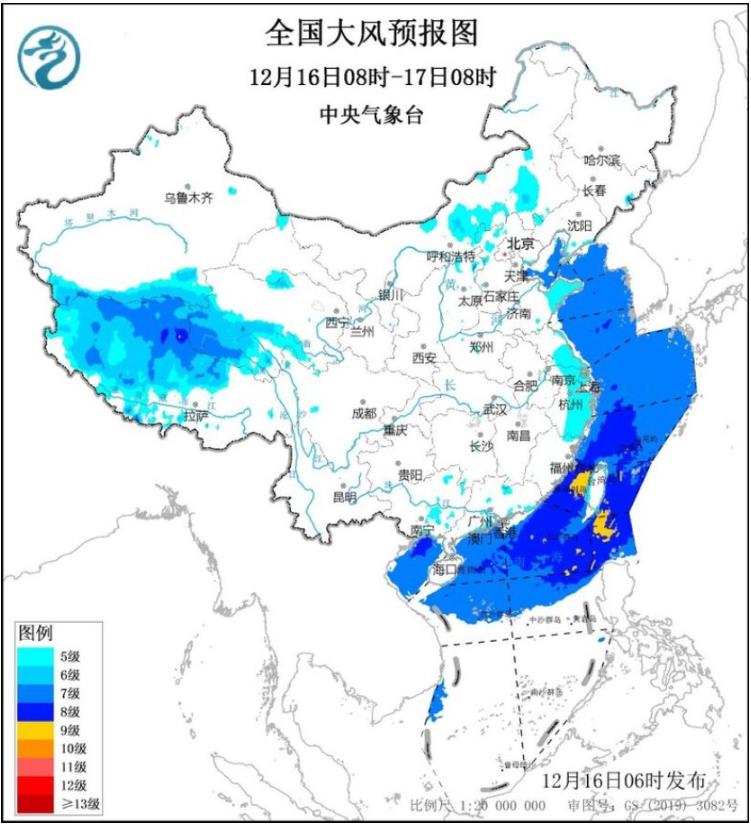 16日白天至18日夜间,受强冷空气影响,渤海、渤海海峡、黄海大部海域、东海大部海域、台湾海峡、台湾以东洋面、巴士海峡、南海大部海域、琼州海峡、北部湾将有6~8级、阵风9级的大风,其中台湾海峡、巴士海峡和南海东北部的部分海域风力可达9级、阵风10~11级。**气象台12月16日06时继续发布大风蓝色预警。