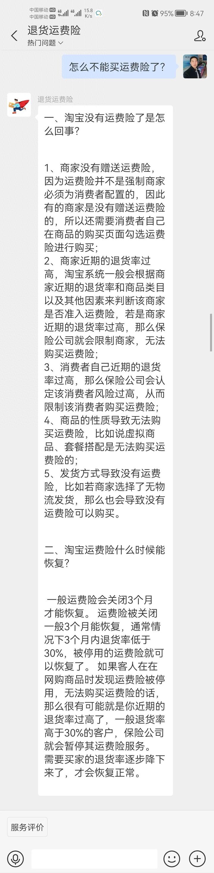 我觉得平台这种做法不能理解,你这运费险不就是方便消费者退货的吗?消费者是感觉不满意才退的,哪有没事干故意为了退货来买东西的?保险的属性本来就存在不确定性,赚个概率,哪有使用**高了你就不干了的道理啊?你要是只卖给不退货的消费者那退货运费险对消费者还有意义吗?幸亏我有两个淘宝账号,不然淘宝购物就不方便了。所以我把的这个经历分享给常上淘宝的朋友们,以免造成同样的问题。你觉得平台的这个规定合理吗?