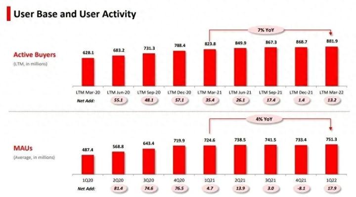 本季度平均月活跃用户为7.513亿,比2021年同期的7.246亿增长4%。截至2022年3月31日12个月期间的活跃买家为8.819亿,比截至2021年3月31日12个月期间的8.238亿增长7%。