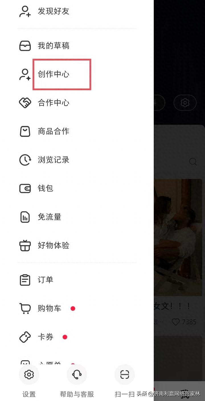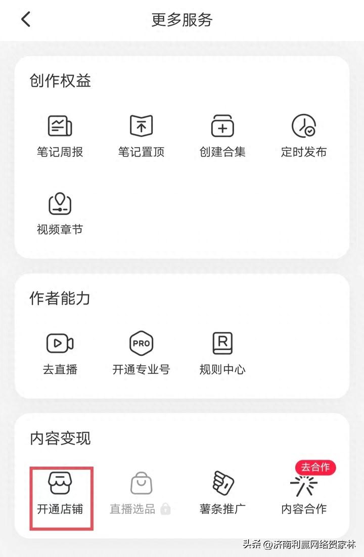 进入app端,点击我,在左上方更多(三个点)中找到创作**,进入更多服务,点击开通店铺,随后立即开店(图示如下)。