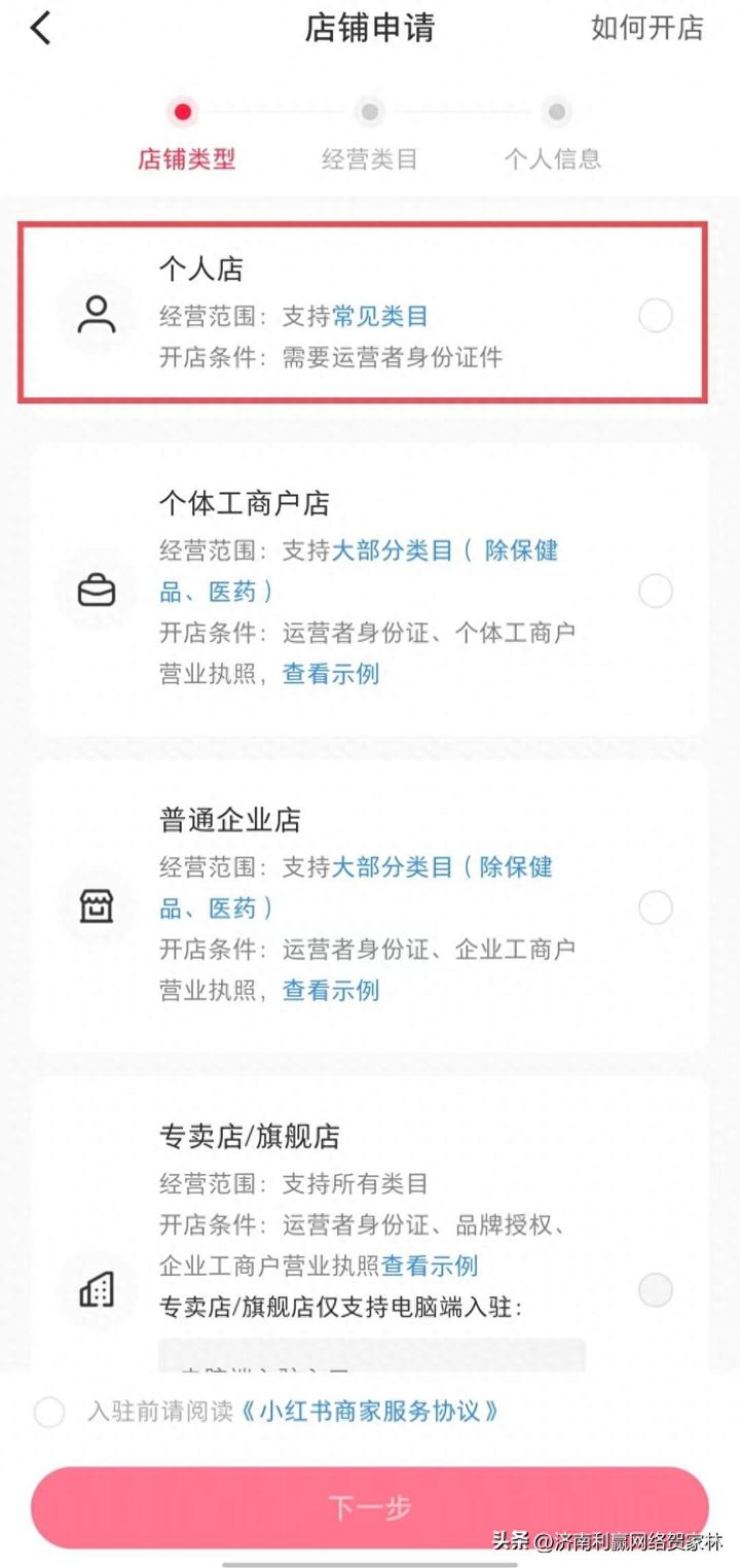 接下来回到操作页面,选择个人店勾选协议,在下一步中选择你的经营类目。若是普通商品商家选择普通商品,若你是露营、滑雪等户外商家请认真观看须知(如下)。