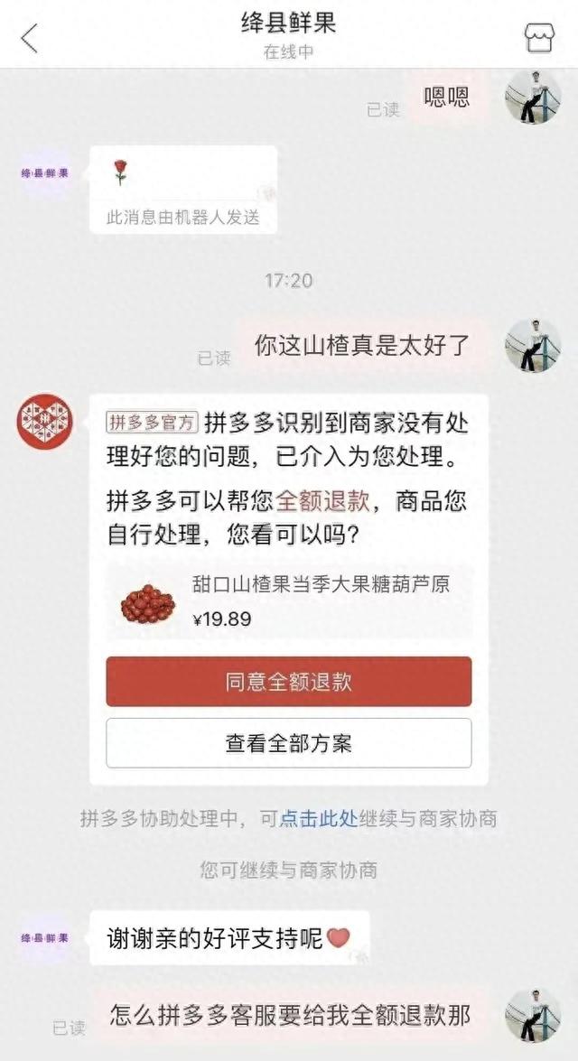 另一方面,拼多多平台,在客户与商家正常聊天过程中,都会弹出一个建议退款的按钮。