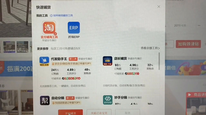 ·选择一个产品,比如这个有一键代发的餐椅。这个可以快速铺货。在这里,我们可以直接在千牛上上架商品。