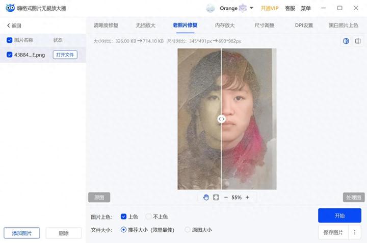 2、上传需要修复的老照片,支持批量上传;进入修复流程,软件会自动对老照片进行修复处理,可以同时勾选上色选项;