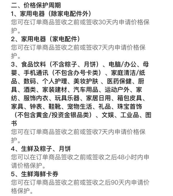 并不是所有自营品类都支持价格保护的,支持价保的各品类价保周期也不尽相同,其中最有代表性的是家电,签收后30天内都可以申请价保。当然,这些是常规的周期,如果是大促期间,标着“价保618”“价保双11”的商品另算。像手机等价保周期短的品类,想要延长价保周期,可以延长送货时间,在下单时送货时间手动改到最长的日期。