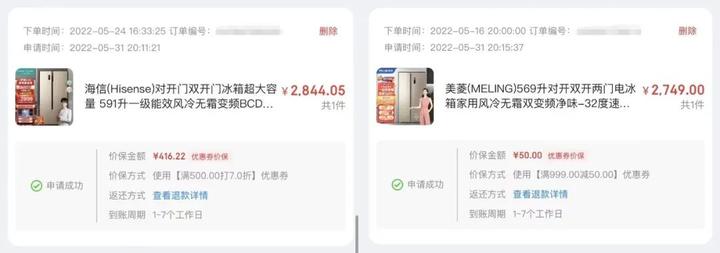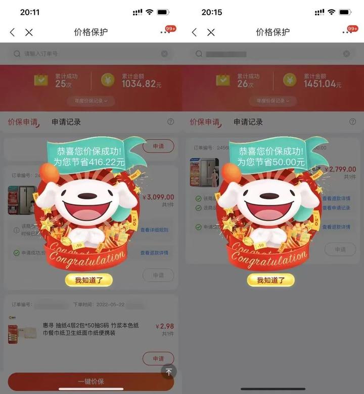 比如学士下面两个订单就是,后来领到券去价保成功的,像家电这种30天价保的商品,你甚至可以像学士这样在618前下单,618开始时抢券价保。