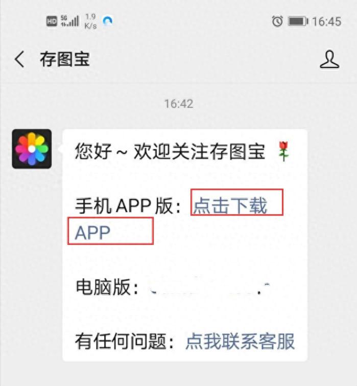 关注好存图宝微信公众号后,点击进入存图宝的微信公众号,并点击“点击下载APP”,将存图宝APP下载到手机桌面上。