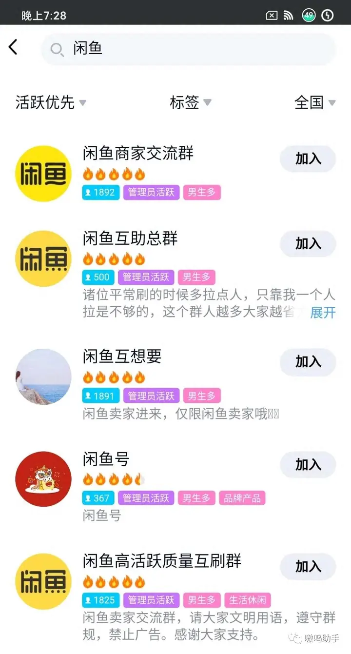 另外想要互想要和互相好评,大家只要登录企鹅账号,搜索闲鱼就可以进入相关群聊。