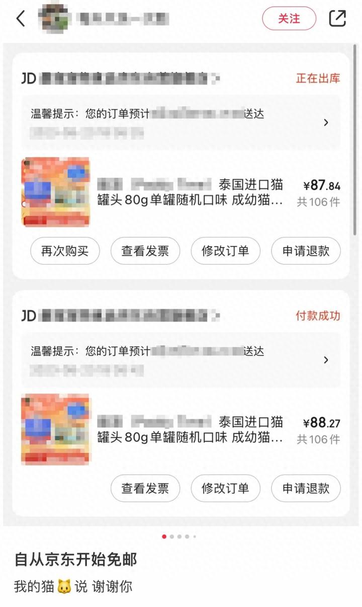 再比如,铲屎官下完单才发现给猫主子们少买了点啥,马上就可以继续下单,也不用像以前一样纠结多花了一张运费券。