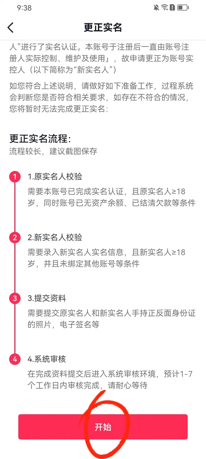 然后我们点开,然后这里有更正实名的说明,然后呢流程我们看完之后呢,点击开始,