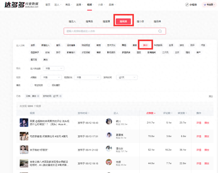 首先,拍什么?模仿同类型账号视频内容,搜索自己所属行业做的比较好的视频:比如我说做美妆的,我选择热门视频榜—选标签美妆,模仿前面几个视频即可: