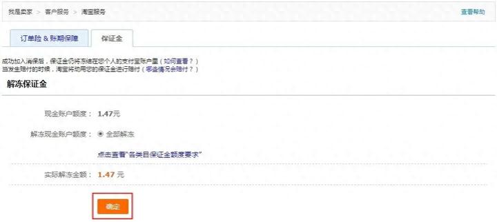 先进入解冻保证金页面,解冻入口:【卖家**】-【淘宝服务】-【消费者保障服务】-【保证金】,点击“解冻”。