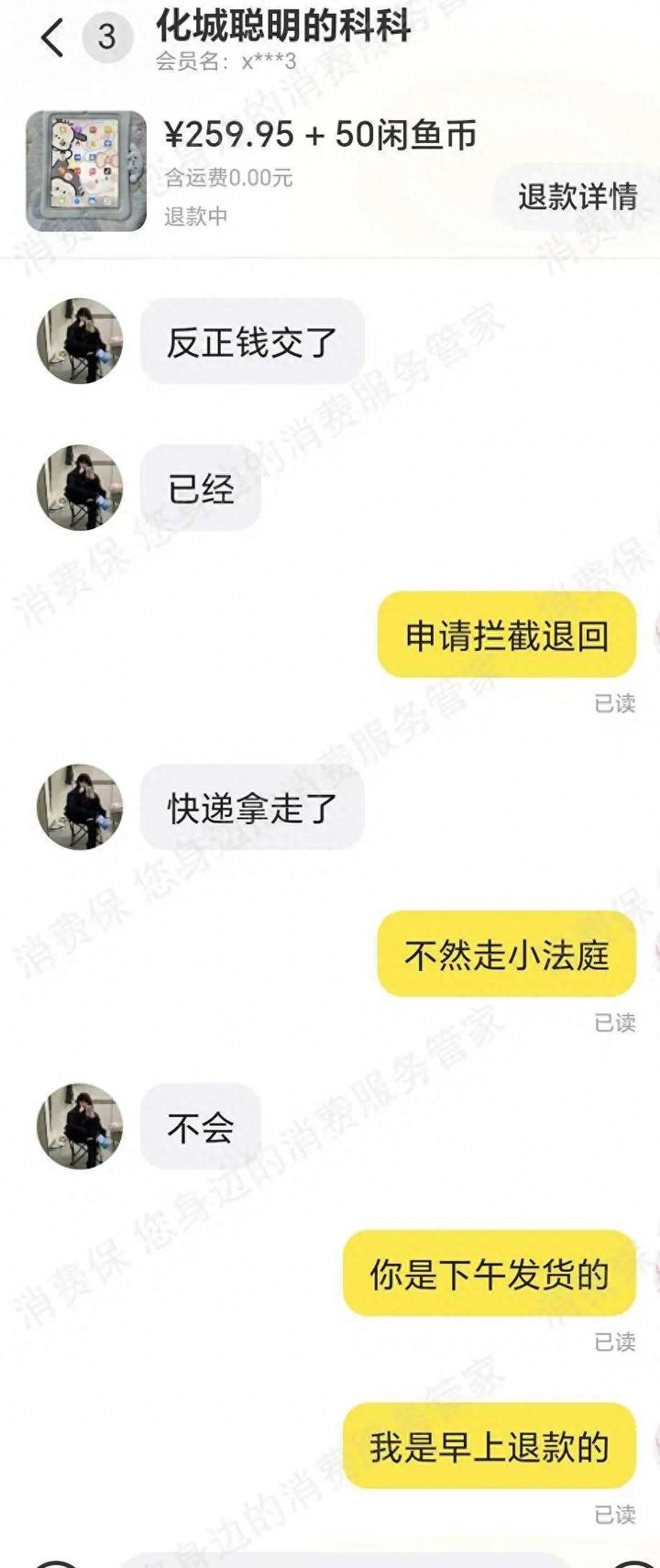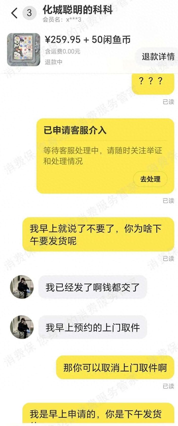 申请退款后,王女士发现卖家不仅拒绝退款,还在当天下午强制发货,该卖家以自己早上就预约取件为理由,拒绝拦截退回。