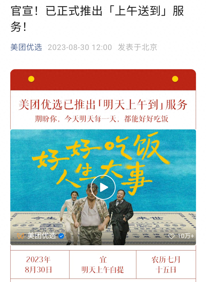 前两天,美团优选还整了点新花样,正式推出了“上午就送到”的配送服务,自提时间从下午 4 点自提加速到上午 11 点。